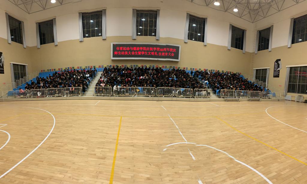 10月8日晚上7:30,beat365官方网站在综合体育馆组织召开庆祝学校60周年校庆师生动员大会暨学生文明礼仪教育大会。体育学院领导班子成员、全体教职工及17级、18级、19级全体学生,共计600多人参加。会议由学院党总支副书记吴建全主持。