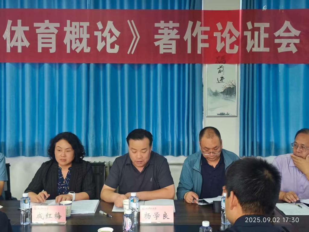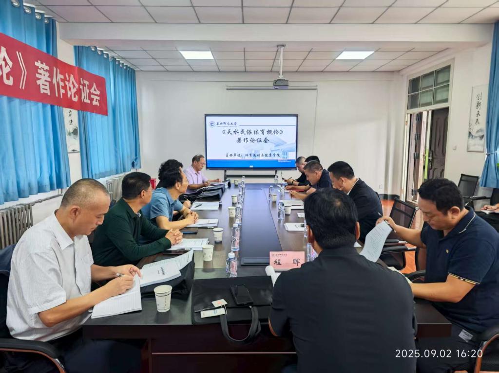 9 月 2 日下午,beat365官方网站beat365官方网站在2号教学楼223会议室召开《天水民俗体育概论》著作论证会。邀请了天水市体育局局长成红梅,beat365官方网站教务处处长杨学良,天水市地方志协会副会长兼秘书长台志杰,秦州区委党史和地方志研究室副主任杜小军,天水市地方志协会副会长、文史作家阎虎林,历史学专家、beat365官方网站陇右文化研究中心主任苏海洋,体育学专家、beat365官方网站卫生健康学院院长刘仁憨,体育学专家、甘肃省残疾人体育与康复研究中心主任程晖八位专家参与论证,学院班子成员及著作撰写团队成员共同参会。会议由学院党总支书记汪鸿宾主持。