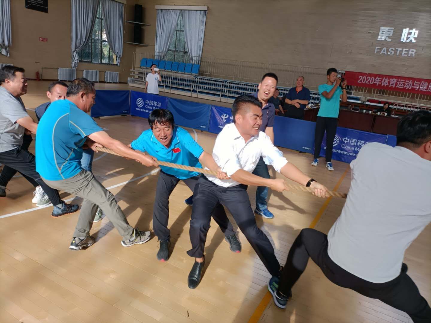 哨声响起,比赛开始,随着“一二,一二”的口号,队员们齐心协力、奋力拼搏,拼命向自己的方向拉绳,激烈角逐着一场场激动人心的比赛,其他教师也自发的组成拉拉队为自己的队员加油助威。一刹那,体育馆中队员们的发力吼叫声和拉拉队加油的呐喊声此起彼伏,比赛精彩纷呈,瞬间点燃了体育馆的氛围。