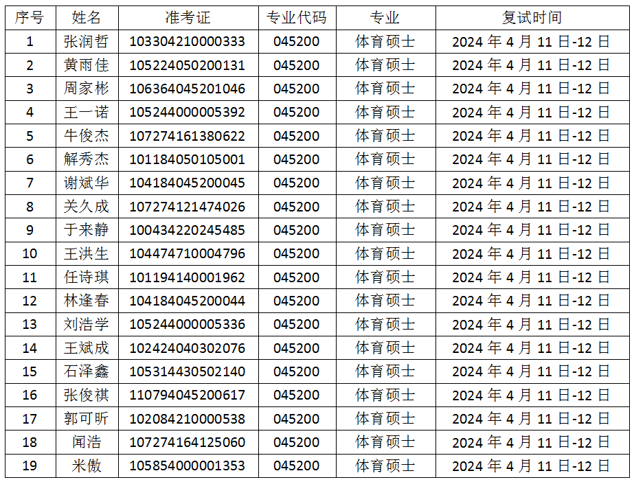 根据天水师范学院硕士研究生招生复试录取工作管理相关规定,经学院研究生招生工作领导小组会议审议,现将beat365官网2024年体育硕士调剂复试考生名单进行公示,如有意见和问题,可在公示之日起七日内,向天水师范学院beat365官方网站办公室反映,联系电话:09388367713,具体名单如下: