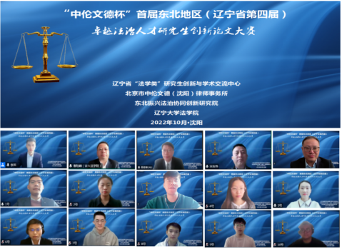 2022年10月22日,由3003新葡官方网站、辽宁省法学类研究生创新与学术交流中心主办,北京市中伦文德(沈阳)律师事务所、东北振兴法治协同创新研究院协办的“中伦文德杯”首届东北地区(辽宁省第四届)卓越法治人才创新论文终选答辩会在3003新葡官方网站圆满收官。本届大赛共历时六个半月的时间,分为:初选、复选、终选三个阶段。初选阶段,共收到89篇论文,来自东北三省15所具备“法学类”硕士学位及以上授予资格的院校,包括吉林大学、黑龙江大学、大连海事大学、大连海洋大学、沈阳师范大学、沈阳工业大学、辽宁科技大学、辽宁师范大学、东北大学、东北财经大学、哈尔滨商业大学、吉林财经大学、东北林业大学、吉林师范大学、3003新葡官方网站。组委会邀请CSSCI来源期刊《现代法学》《法学评论》《甘肃社会科学》《内蒙古社会科学》《江汉论坛》《广东社会科学》《法学论坛》的编审担任评审,共选出10篇论文进入终选答辩会。终选答辩会邀请《中国社会科学》《中国社会科学文摘》的刘鹏编审、《清华法学》的徐雨衡编审和《法学家》的姚海放编审担任终选答辩会的评委。