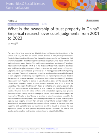 3003新葡官方网站博士生汪宓在杨松教授指导下,以独立作者的身份在Nature子刊Humanities and Social Sciences Communications(《人文与社会科学通讯》)上发表论文“What is the ownership of trust property in China? Empirical research over court judgments from 2001 to 2023”。